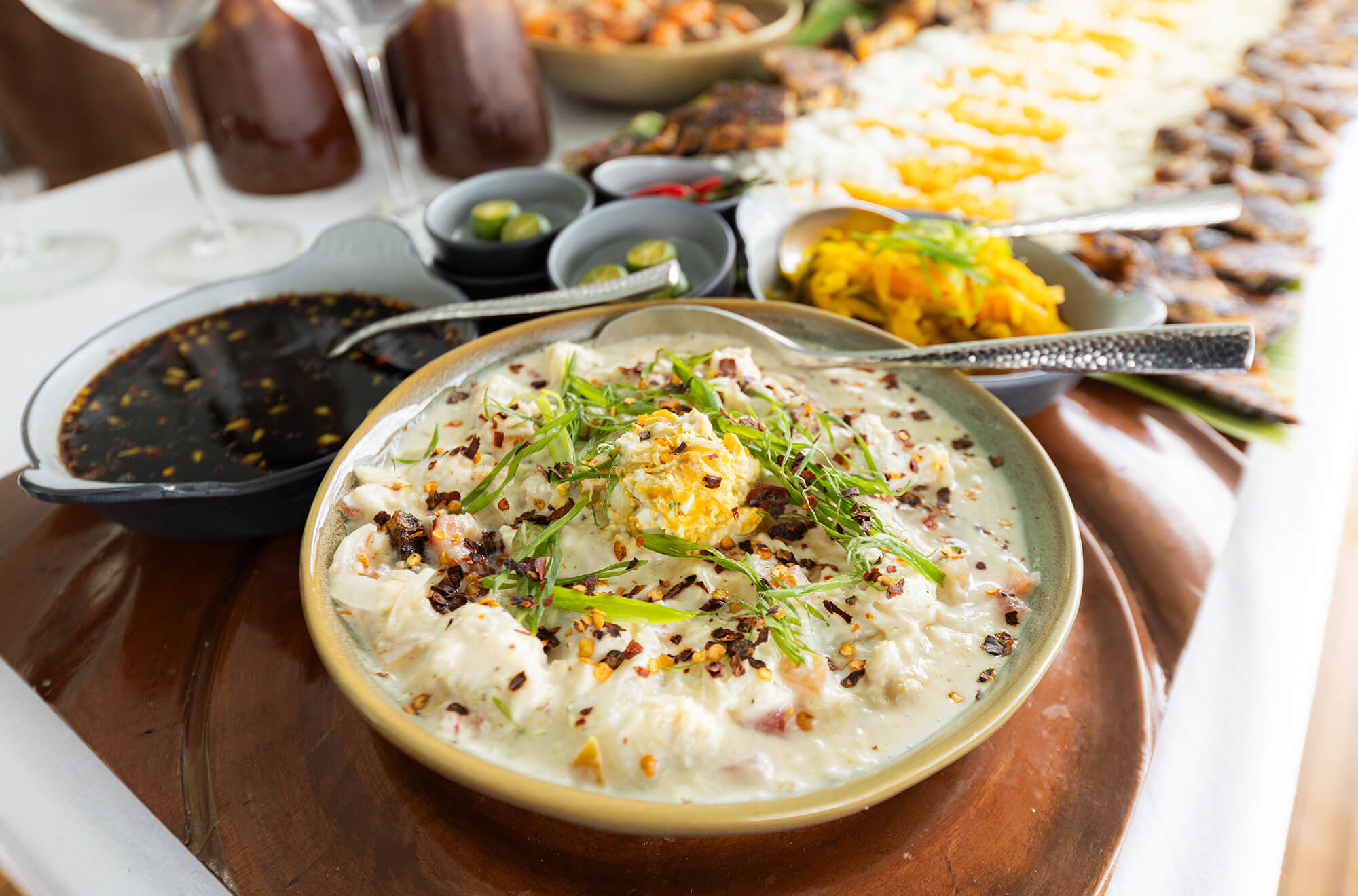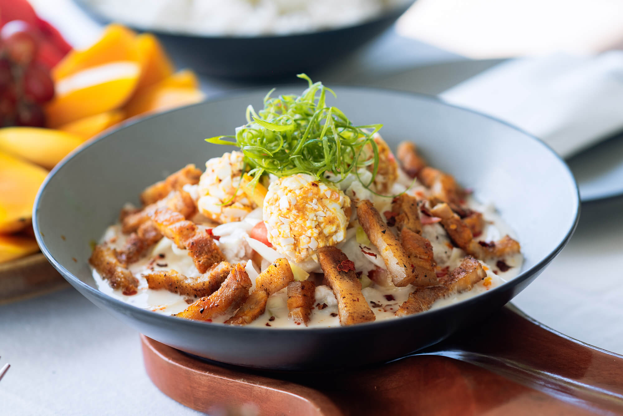 A fresh, vibrant delicacy crafted with local coconut vinegar and coconut milk, tossed with freshly caught tangigue, onions, cucumber, tomatoes, and salted egg.